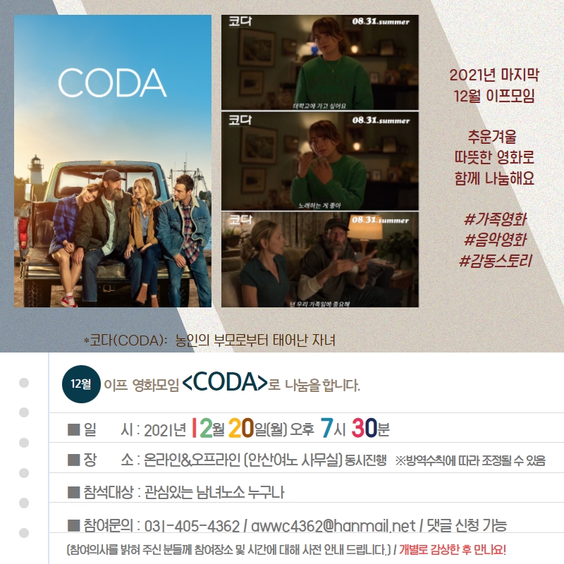 안녕하세요^^ 12월 이프는 영화「CODA」로 나눔합니다. 영화는 개별 감상후 만나요~! 영화감상은 아래방법을 참고해 주세요. ① 티빙, 네이버 ② 12월 12일 일요일 낮 1시20분 신사동에 위치한 '이봄