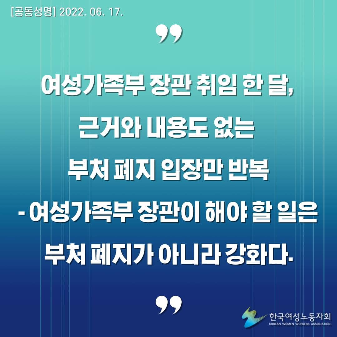 근거도, 합의도 없이 계속해서 ‘여성가족부 폐지’를 주장하는 것은 현행 법제도, 행정체계, 정책수요자와 당사자에게 국가역할을 방기하는 행위로 보일 뿐이다. 여성가족부 장관은 여성가족부 폐지 입장을 철회하고, 성평등 전담부처인 여성가족부를 강화하는 비전과 정책을 마련하라.
