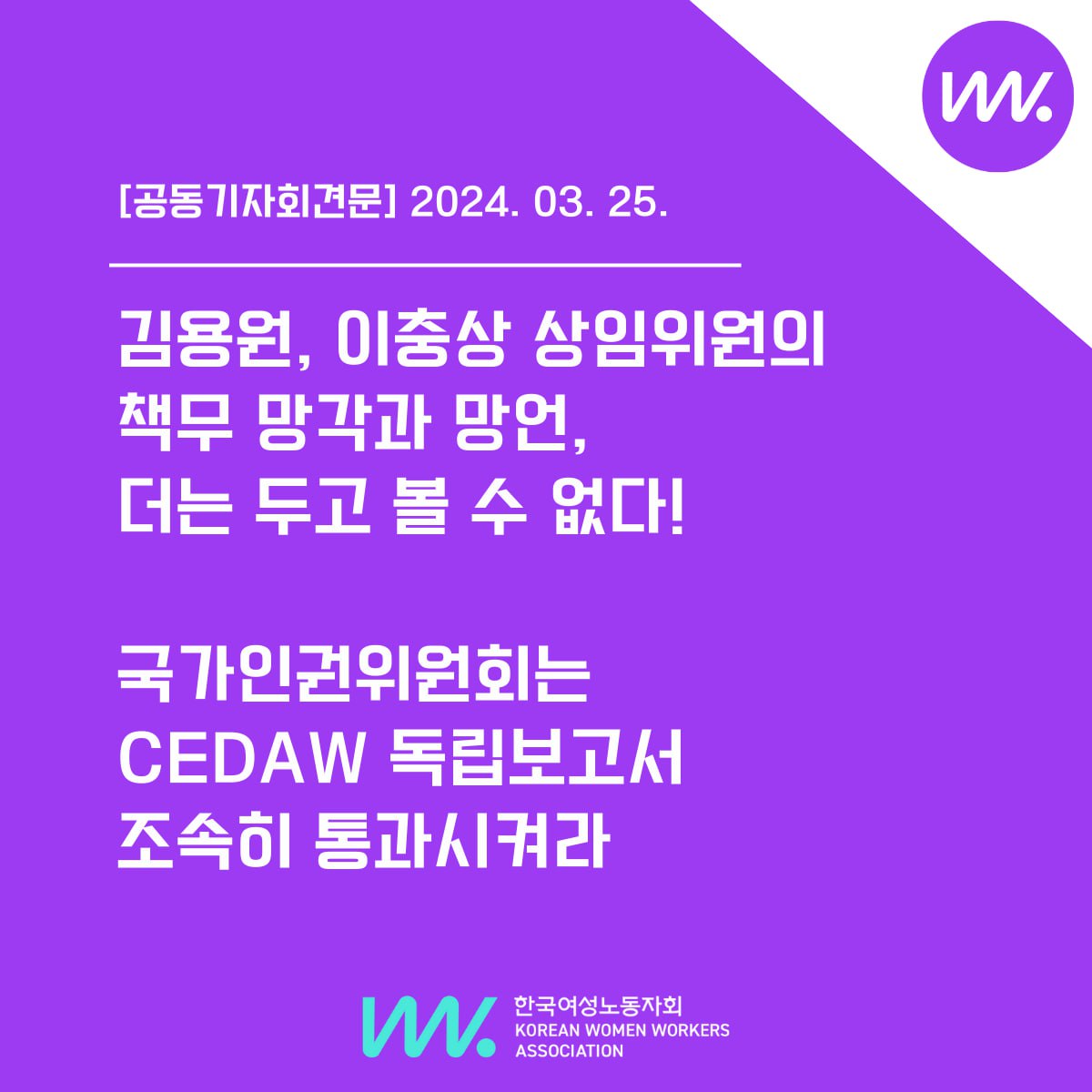 한국의 성격차지수는 2023년 기준 146개국 가운데 105위, 성별임금격차는 OECD 국가 중 27년째 부동의 1위이다. 한국 사회에 ‘구조적 성차별은 없다’며 성평등 정책 전담부처 폐지를 공약으로 내세운 대통령이 취임한 후 2년여 동안 성평등·여성인권 정책 퇴행이 급속도로 이루어졌다. 그로 인해 여성들의 일상과 노동 현장은 더욱 위태롭게 흔들리고 있다. CEDAW 위원회에 한국 여성인권 현안에 대한 상세한 정보를 제공하고, 위원회가 인권 관점으로 한국정부에 정책 개선을 권고할 수 있도록 참고자료로써 기능하는 인권위 독립보고서는 그 어느 때보다 더 중요하다. 인권위는 유엔에 제출할 CEDAW 독립보고서를 조속히 통과시켜 인권위의 기본 책무를 지금이라도 다하길 바란다. 또한 상임위원으로써의 책무를 망각하고 혐오와 차별 선동에 앞장서며 인권위 기능과 역할을 마비시키는 김용원과 이충상을 우리는 더는 두고 볼 수 없다.