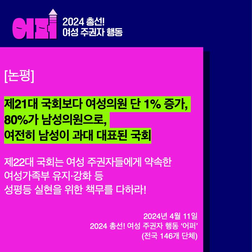 성평등 가치는 나중이 아니라 지금 당장 추구하고 실현해야 할 가치이다. ‘여성 주권자 행동 ‘어퍼’’는 각 정당과 제22대 국회가 한국사회에 만연한 구조적 성차별과 여성, 소수자를 향한 배제와 혐오의 사슬을 끊기 위해 어떻게 의정활동을 진행하는지 끊임없이 감시하고 목소리를 낼 것이다.