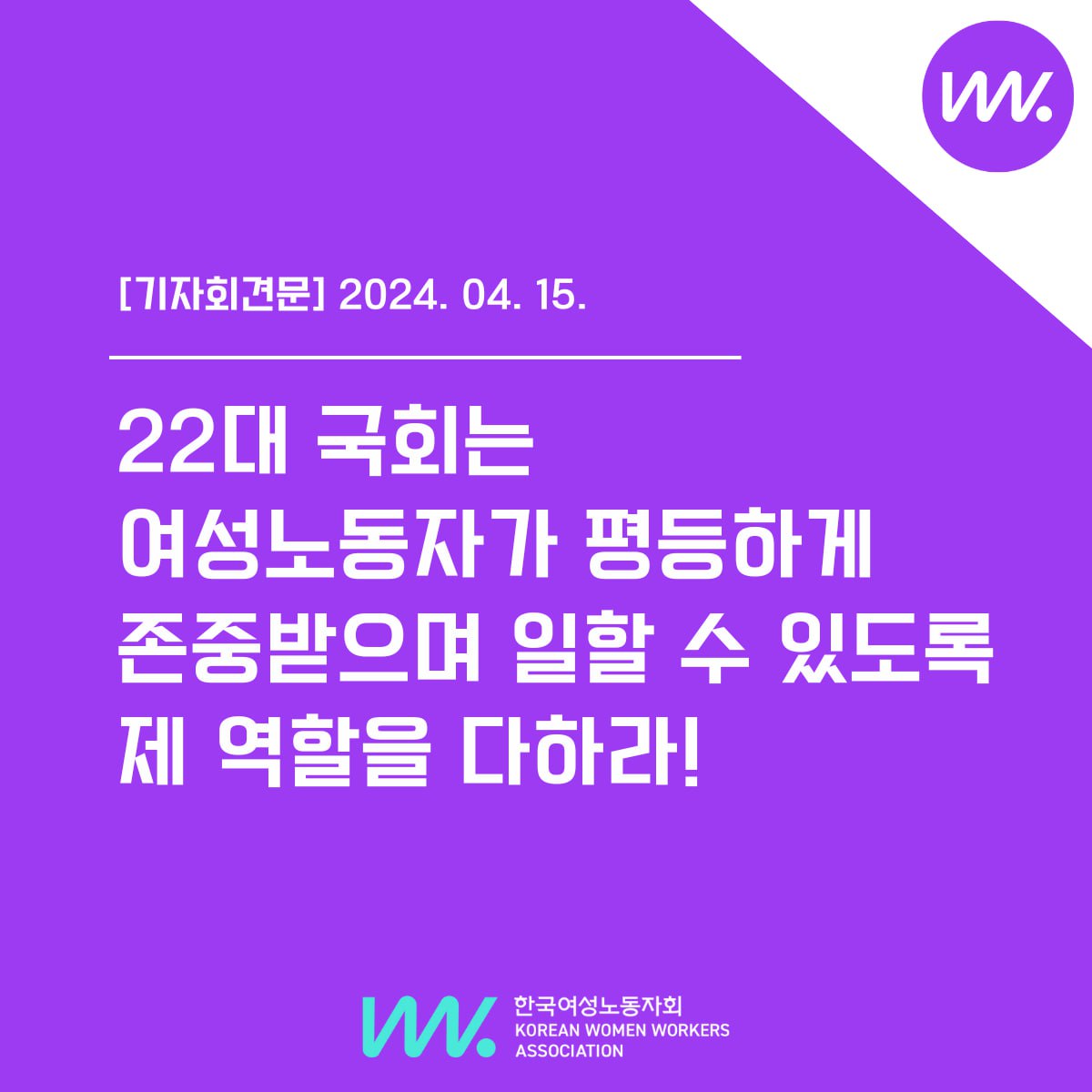 192석 범야권 국회를 만들어준 시민들의 마음을 읽어야 한다. 퇴행을 멈추고 성평등 사회로 전환할 수 있는 22대 국회를 만들어갈 것을 여성 노동자들은 요구한다.