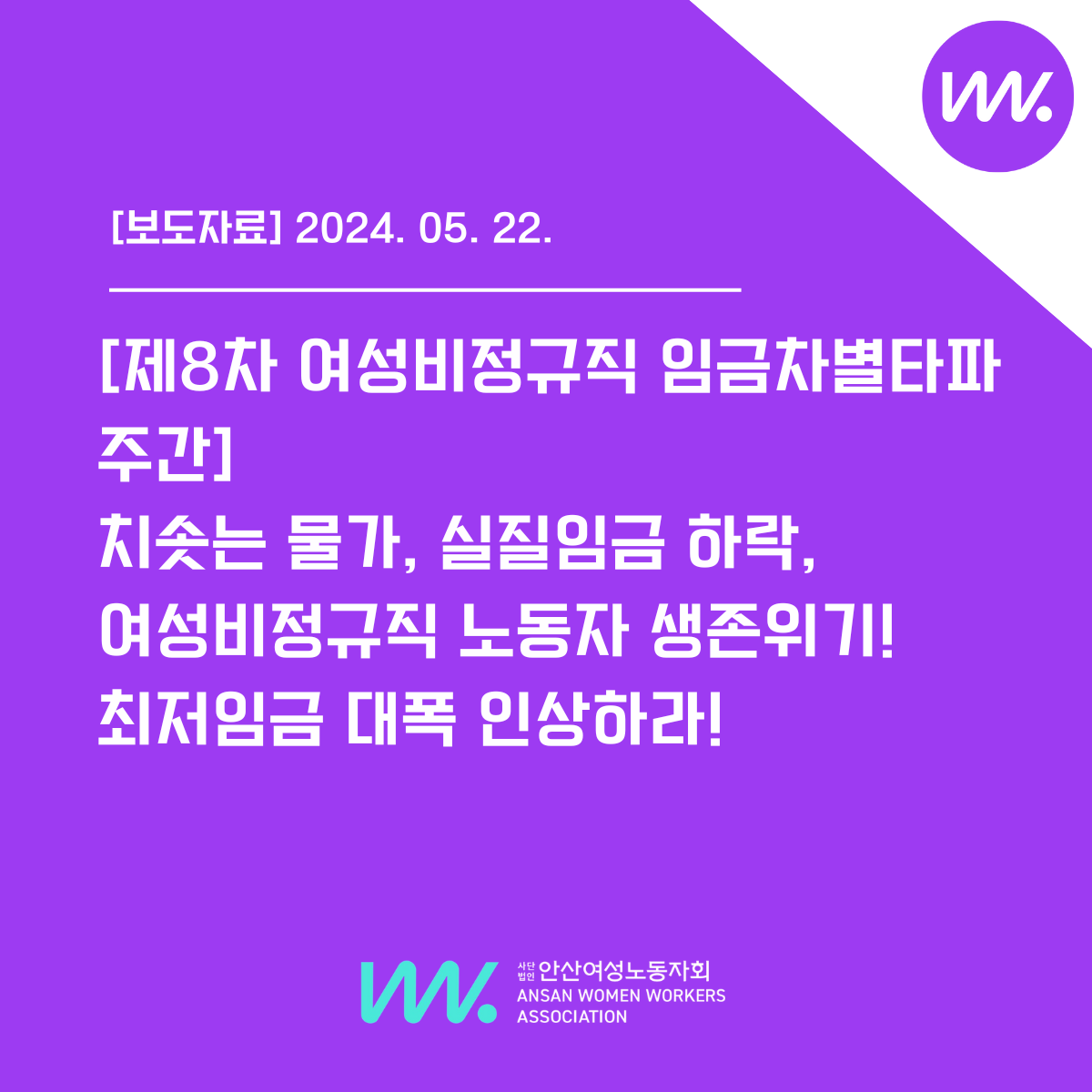 | [기자회견문][제8차 여성비정규직 임금차별타파 주간 기념 기자회견]치솟는 물가, 실질임금 하락, 여성비정규직 노동자 생존 위기!최저임금 대폭 인상하라!! (1) | 2024.05.23 |