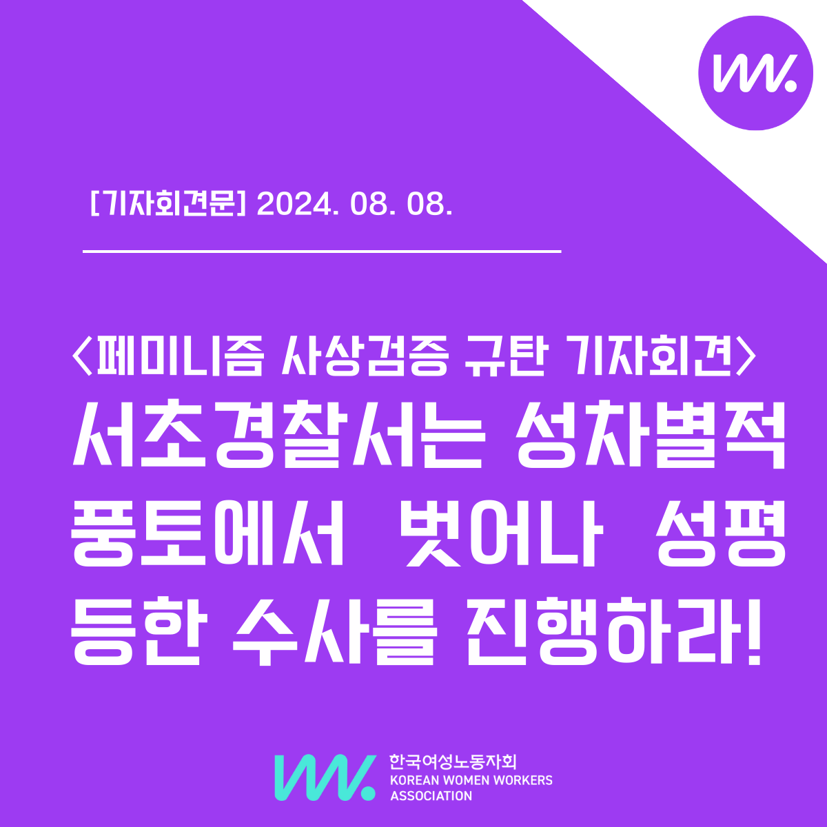 불행 중 다행히도 어제 서초경찰서는 해당 사안을 각하 결정한 것에 대해 미흡함이 있었다는 점을 시인하고 재수사 진행을 결정했다고 밝혔다. 하지만 같은 날 서초경찰서는 한 언론을 통해 “(피해자의 회사가) 오해를 받게끔 대응이 이뤄져 사람들이 의견을 표명한 것"이고 “명예훼손 (무죄) 사건을 보면 (피해자가) 자초한 점이 있다는 판례가 많다”며 전형적인 피해자 탓하기 태도를 보였다. 재수사 결정에도 불구하고 다시금 분노와 함께 걱정과 우려가 먼저 앞서는 이유다. 제대로 된 재수사가 진행되기 위해서는 수사 과정의 미흡함 뿐만 아니라, 그 미흡함을 스스로 초래하게 된 배경인 성차별적 관점에 대한 반성과 성찰이 필요하다. 우리는 앞으로 진행될 재수사가 성평등하고 정의로운 방향으로 진행될 수 있도록 다음과 같은 사항을 서초경찰서에 요구한다.