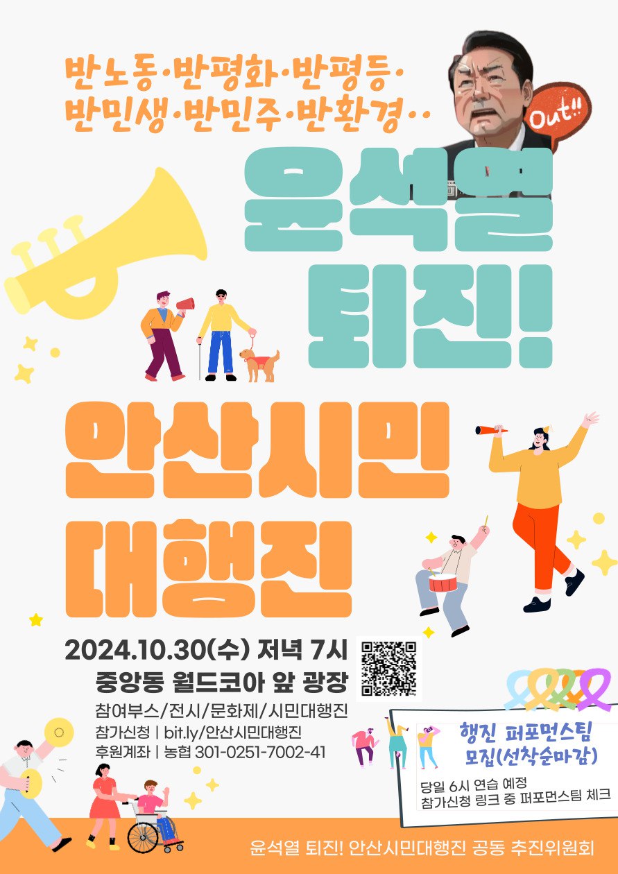 - 주최 : 윤석열 퇴진! 안산시민대행진 공동 추진위원회 (문의 : 031-411-6150)