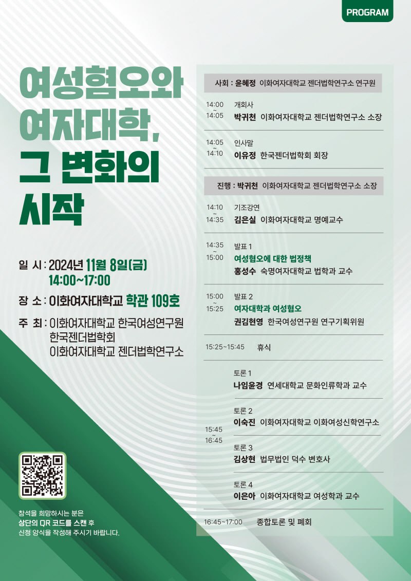 이화 젠더법학연구소에서는 한국여성연구원과 한국젠더법학회와 함께 준비 중인 11월 8일(금), "여성혐오와 여자대학, 그 변화의 시작"을 주제로 한 토론회에 여러분을 모시고자 합니다.
