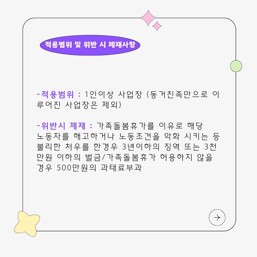 위반시 제재 : 가족돌봄휴가를 이유로 해당 노동자를 해고하거나 노동조건을 악화시키는 등 불리한 처우를 한 경우 3년 이하의 징역 또는 3천만원 이하의 벌금 / 가족돌봄휴가 허용하지 않을 경우 500만원의 과태료 부과