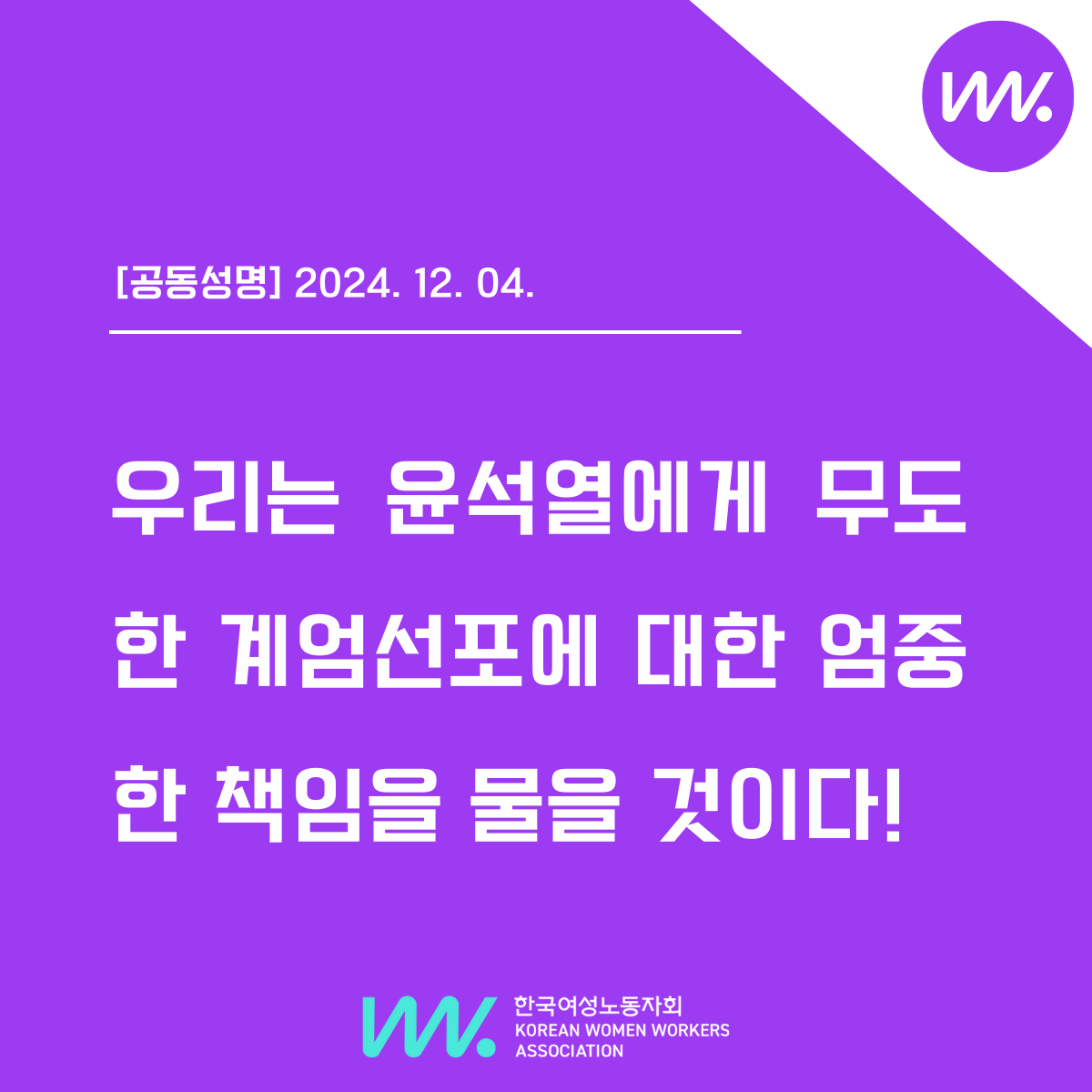 위법적이고 위헌적이며 시대착오적인 비상 계엄을 선포한 무도한 윤석열은 스스로 대통령으로서의 자격이 없음을 실토한 것이다. 윤석열은 대한민국 헌정질서를 파괴하였다. 국가 전체를 공포와 혼란에 빠뜨려 시민들의 안전과 안위를 위협하였다. 윤석열은 이번 사태에 엄중한 책임을 져야할 것이다. 그것이 정당한 절차이자 역사적 과정이다. 여성노동자회는 윤석열에게 책임을 묻고 대한민국의 민주주의를 수호하는 길에 함께할 것이다.