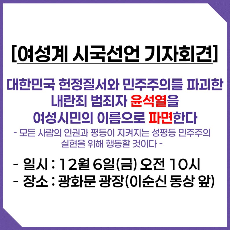 이에 따라 여성계는 대한민국 헌정질서와 민주주의를 파괴한 내란죄 범죄자 윤석열을 파면하고, 그가 일으킨 내란죄에 대해 엄정한 처벌을 받을 것을 요구하는 <여성계 시국선언> 기자회견을 12월 6일(금) 오전 10시 광화문 광장에서 진행하고자 합니다. 많은 관심 부탁드립니다.