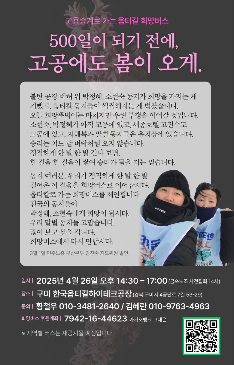 동지 여러분, 우리가 정직하게 한 발 한 발 걸어온 이 걸음을 희망버스로 이어갑시다. 옵티칼로 가는 희망버스를 제안합니다. 전국의 동지들이 박정혜, 소현숙에게 희망이 됩시다. 우리 말벌 동지들 고맙습니다. 많이 보고 싶을 겁니다. 희망버스에서 다시 만납시다.