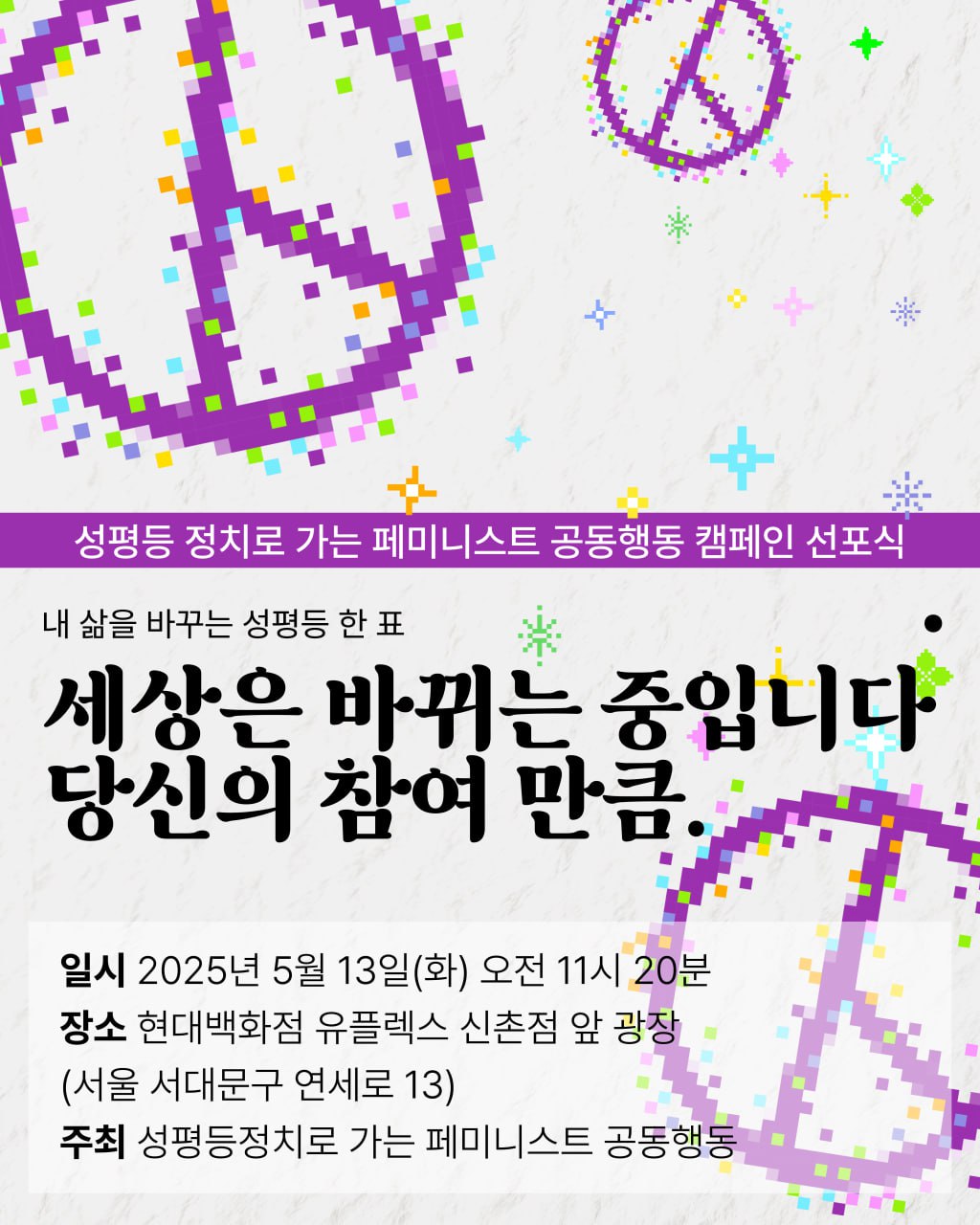 | 🌈 성평등 정치로 가는 페미니스트 대행진, 이렇게 진행됩니다! (0) | 2025.05.08 |