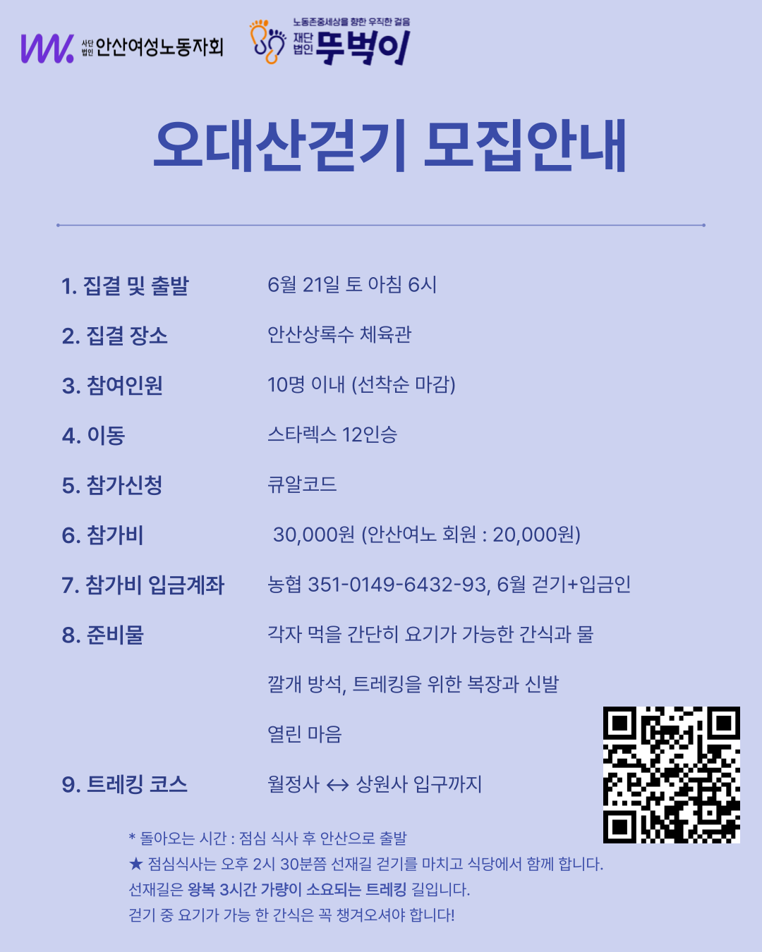 * 참가비 : 30,000원 (안산여노 회원 : 20,000원)