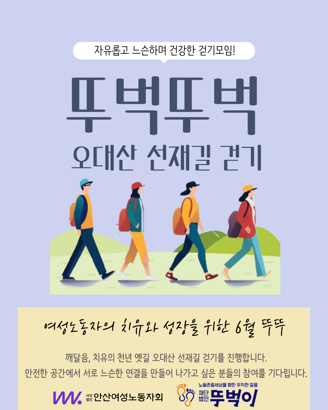 안산여성노동자회 뚜벅 뚜벅 소모임은 여성노동자들의 몸과 마음을 치유하고 회복하기 위한 걷기 모임입니다.
