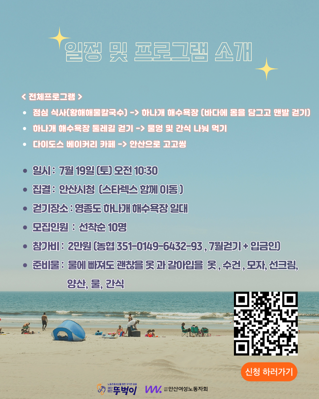 점심 식사(황해해물칼국수) -> 하나개 해수욕장 (바다에 몸을 담그고 맨발 걷기) -> 하나개 해수욕장 둘레길 걷기 ->