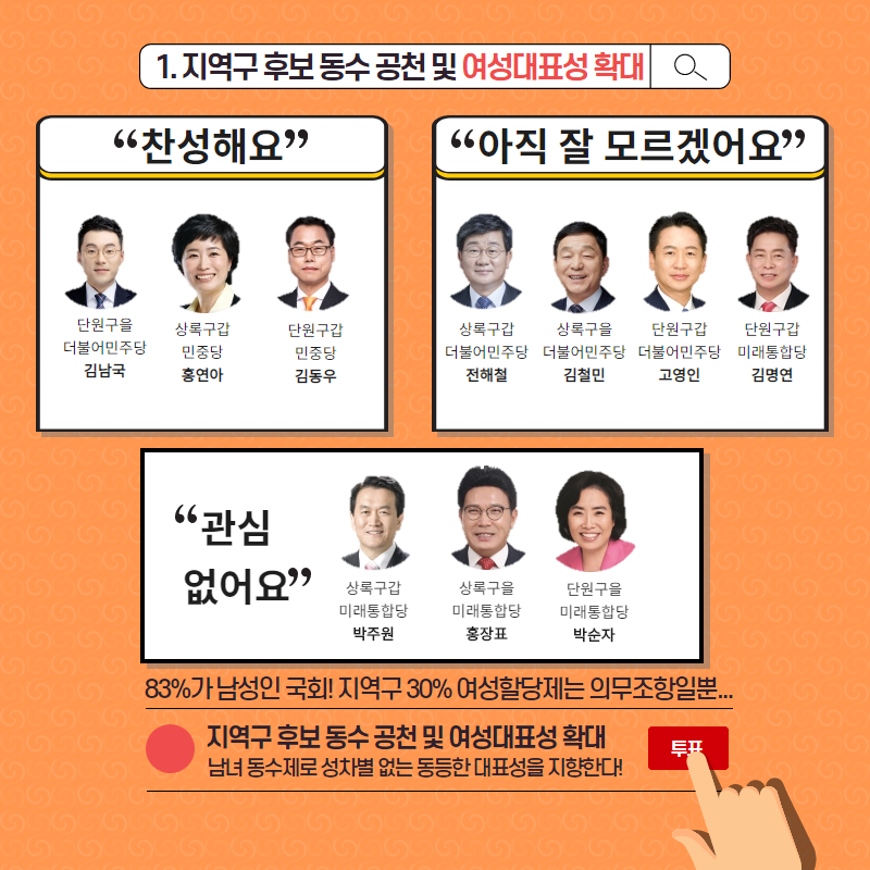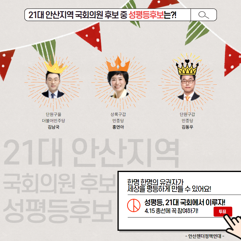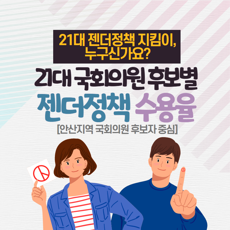그래서 안산젠더정책연대가 21대 안산지역 국회의원 후보 젠더정책 지킴이를 찾아 나섰습니다!