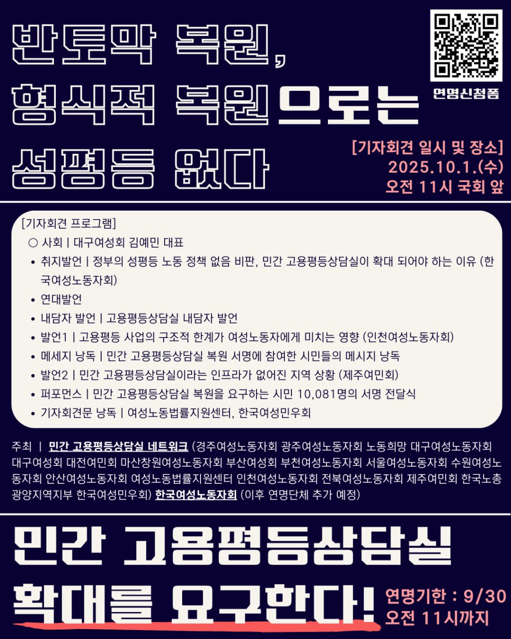 [기자회견 연명 요청] 반토막 복원, 형식적 복원으로는 성평등 없다. 민간 고용평등상담실 확대를 요구한다! 기자회견 연명 요청