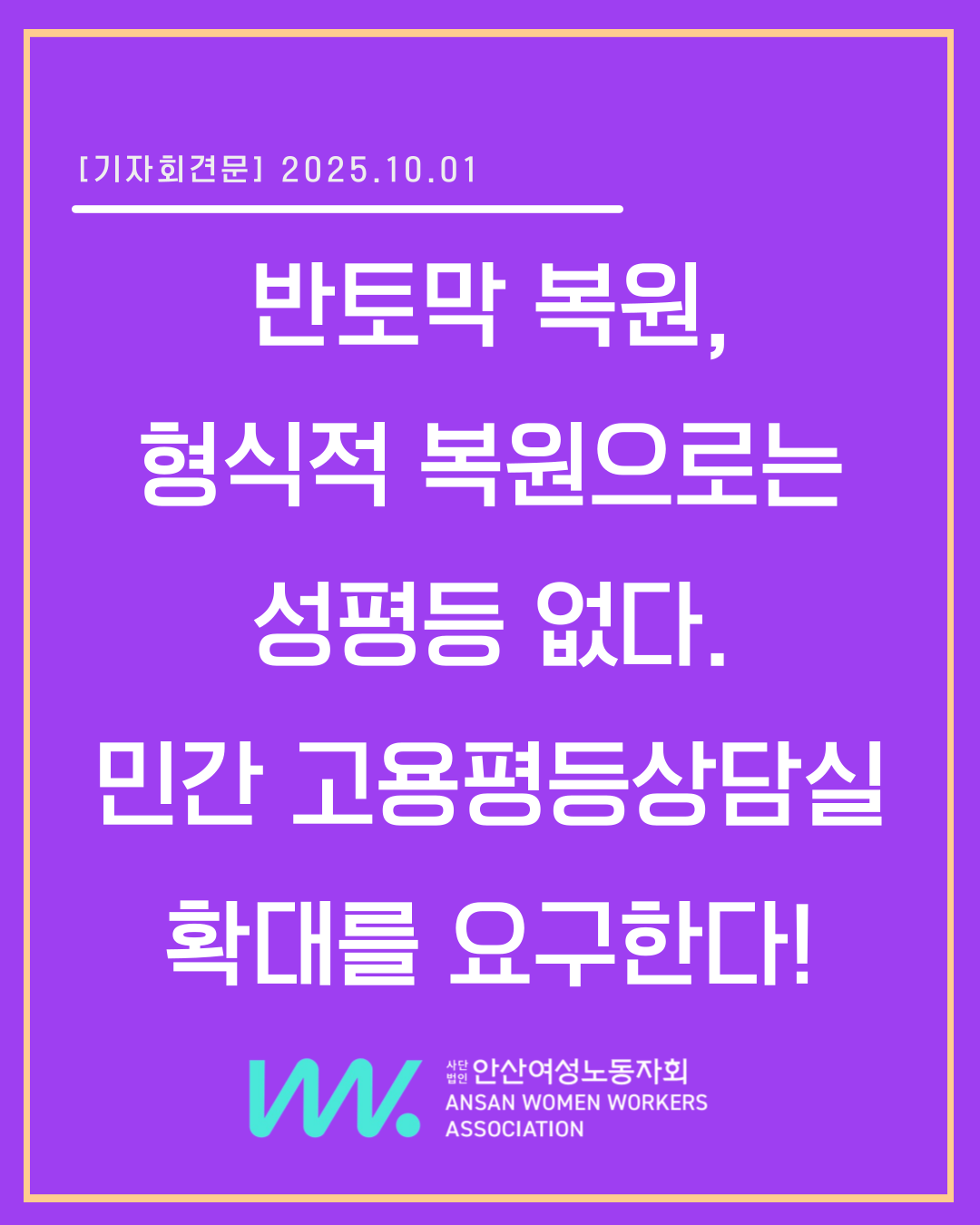 이재명 대통령은 UN연설에서 "AI 시대의 변화에 수동적으로 끌려다닌다면 기술 악용으로 인한 인권침해의 그 어두운 그림자를 떨쳐내지 못한 채 양극화와 불평등 심화라는 디스토피아를 맞이하게 될 것"이라고 말했다. 그러나 여성노동자에게 지금의 대한민국은 이미 성차별 디스토피아다. 직장 내 성희롱, 성차별로 인한 피해는 여전히 그 사실을 인정받기 어려운 것이 현실이기 때문이다. 여성노동자의 일경험에 드리운 "인권침해의 어두운 그림자"를 떨쳐내기 위해서는 무엇보다 성평등 노동 실현을 위한 정책 수립과 실행을 위한 정부의 노력이 필요하다. 그 첫걸음은 민간 고용평등상담실 복원을 넘어 확대여야 한다. 우리는 다음과 같이 요구한다.