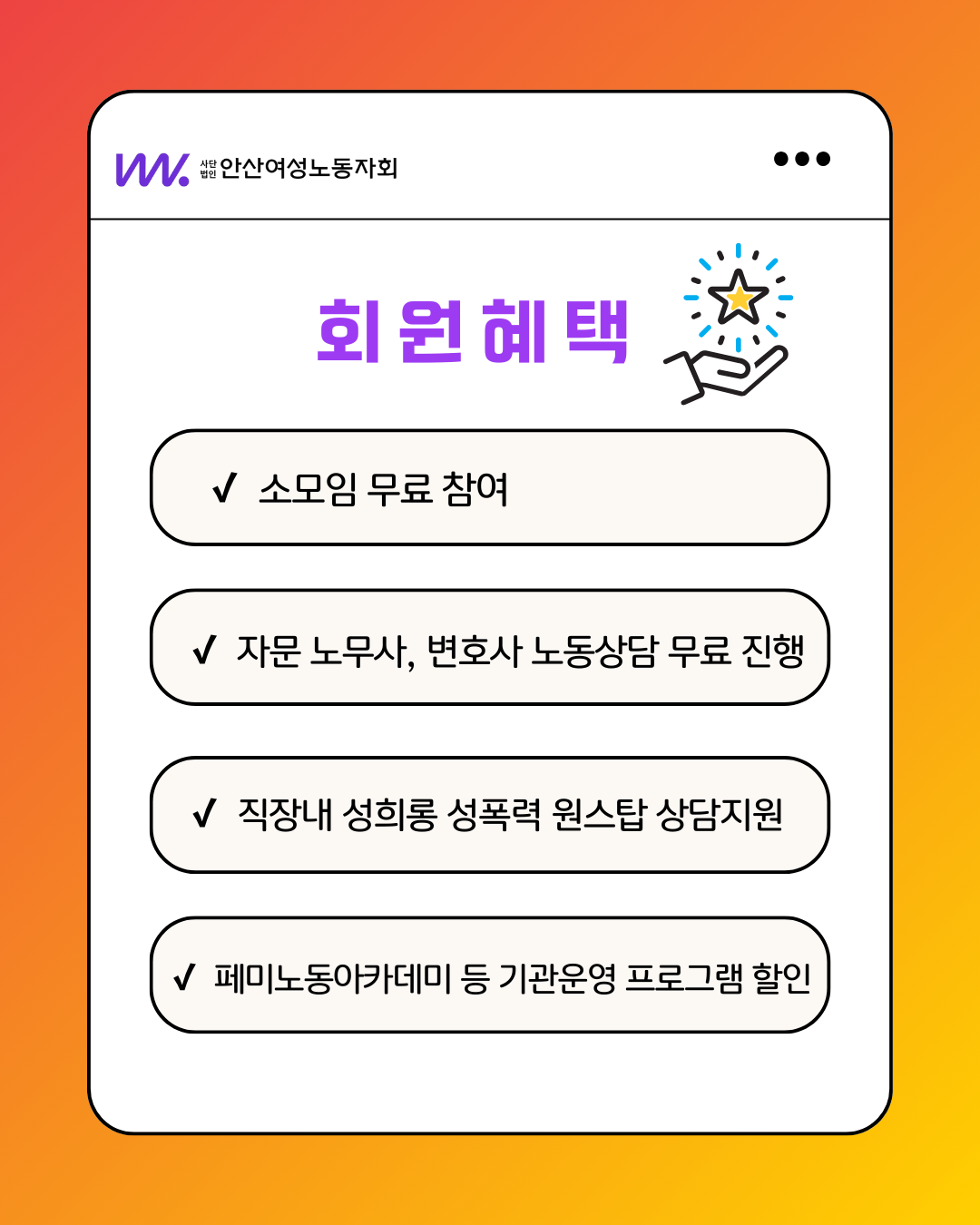 ✔ 소모임 무료참여✔ 노무·법률 상담✔ 직장 내 성희롱 원스톱 지원✔ 다양한 아카데미 할인