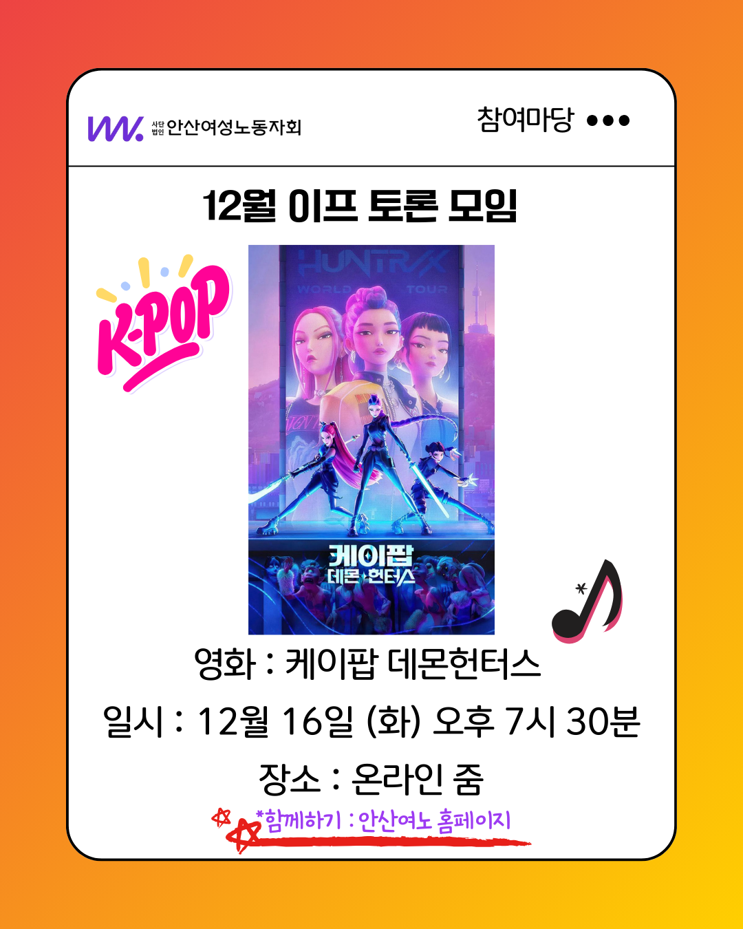 12월에는 영화 〈케이팝 데몬헌터스〉 토론, 아로마 화장품 만들기 등 다양한 프로그램도 기다리고 있어요.
